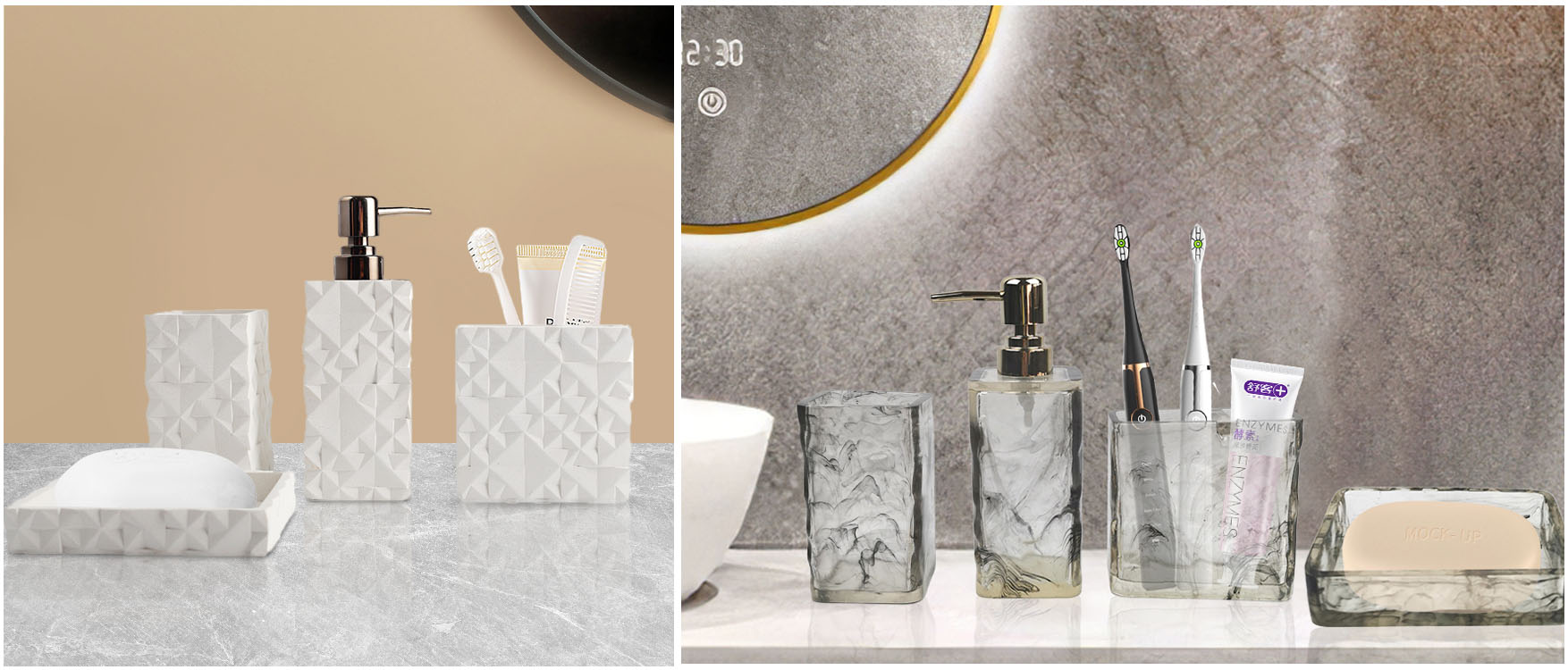 Modern simple resin bathroom accessory setsThis is a high quality Nordic style bathroom kit, creative line texture, simple atmospheric design. There is a natural marble appearance presented by the texture .view more -